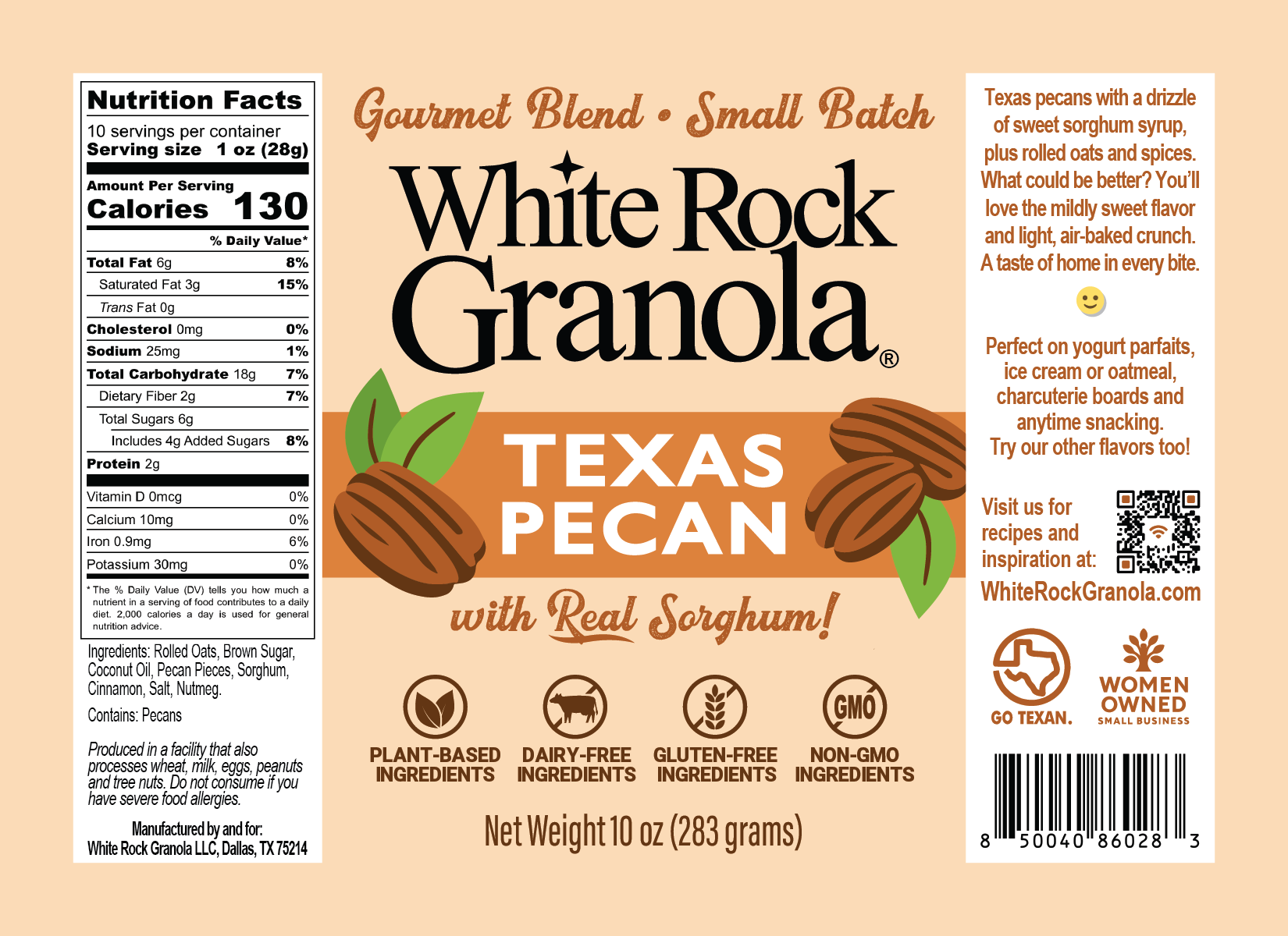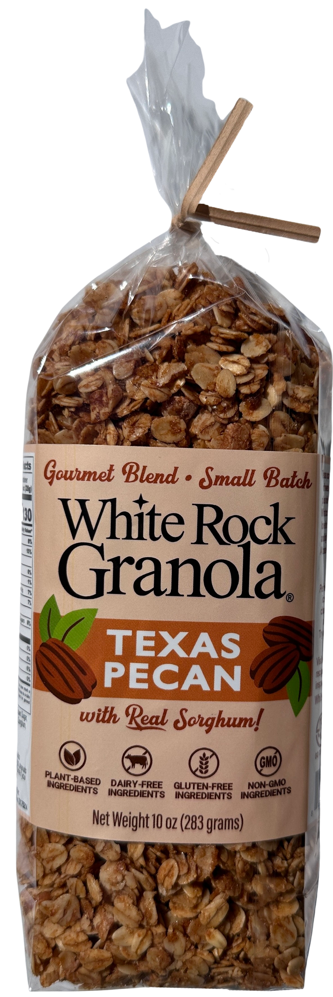 Howdy there! Yer jest gonna’ love White Rock Granola’s Texas Pecan Granola! Loaded with genuine Texas pecans, sweet sorghum syrup and coconut oil – with crunchy gluten-free rolled oats, it’ll tickle yer tastebuds like a Texas prairie breeze. Yeehaw!